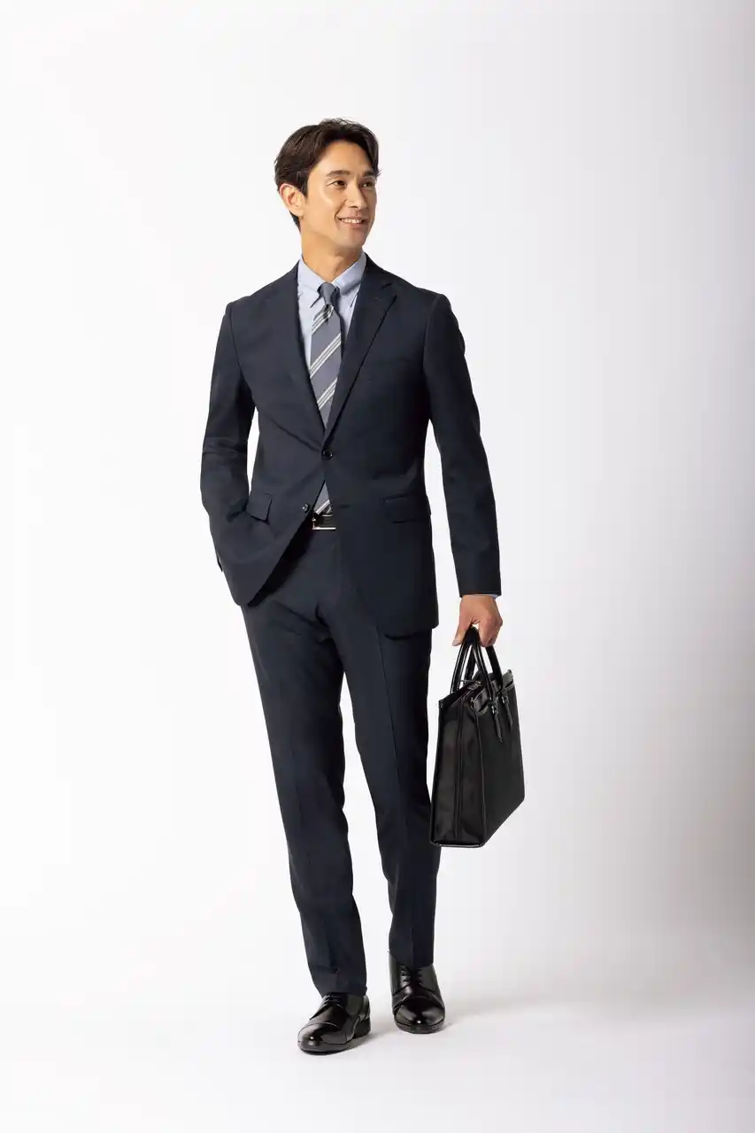 上下同商品のセットアップスタイルにネクタイを着用した、ビジネスシーンで汎用性の高い着こなしです。 |