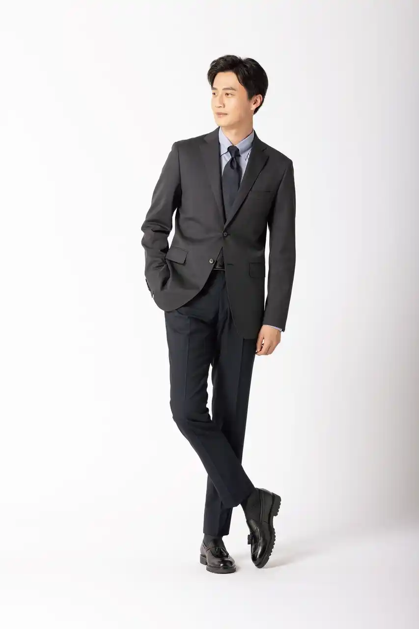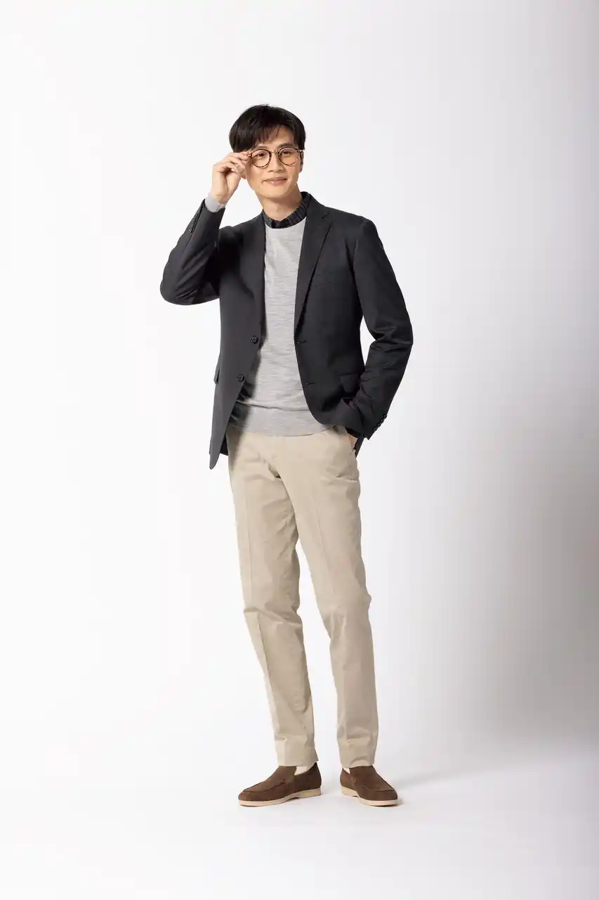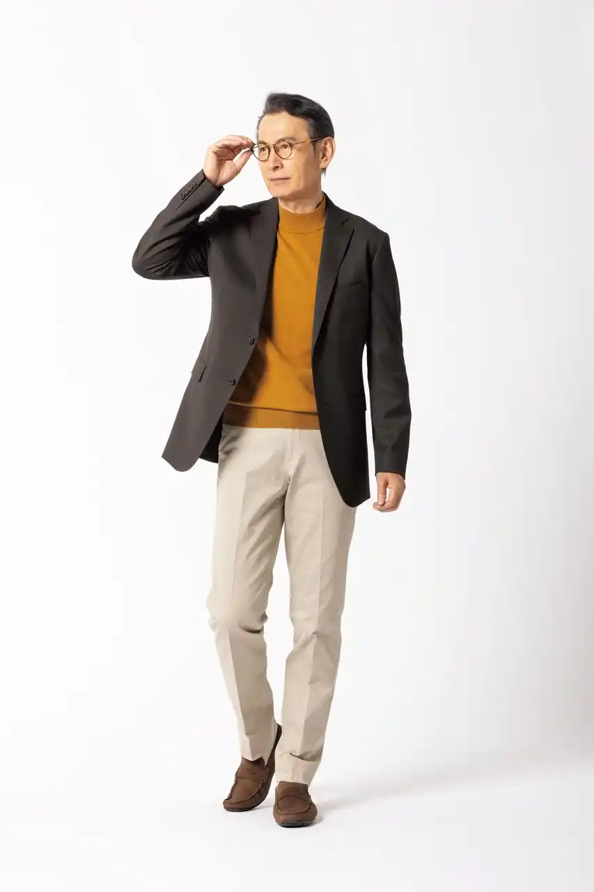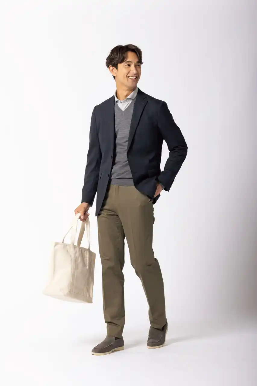 ジャケットとパンツで別の色を着用する、ビジネスカジュアルに取り入れやすい着こなしです。 |