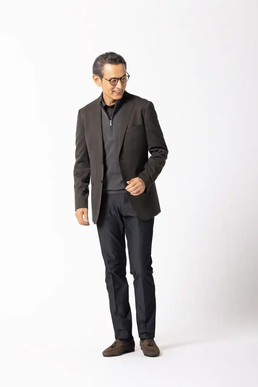 重厚感のあるブラウンと落ち着いた濃いめのグレーがシックで洗練された印象。インナーはニットにすることでリラックス感をプラスできます。 |