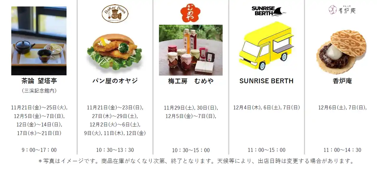 ポップアップカフェスペース茶論望塔亭にて「日本茶専門店 茶倉 SAKURA」がお茶や和菓子を提供します。また、根岸駅にあるコッペパンが人気の「パン屋のオヤジ」、横浜ゆかりの杉田梅を使った手作り梅加工食品店の「梅工房むめや」、漁師さんのキッチンカー「SUNRISE BERTH(サンライズバース)」、元町の和菓子店「香炉庵」が期間限定で出店します。 |