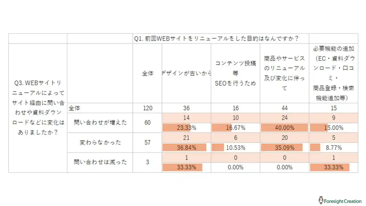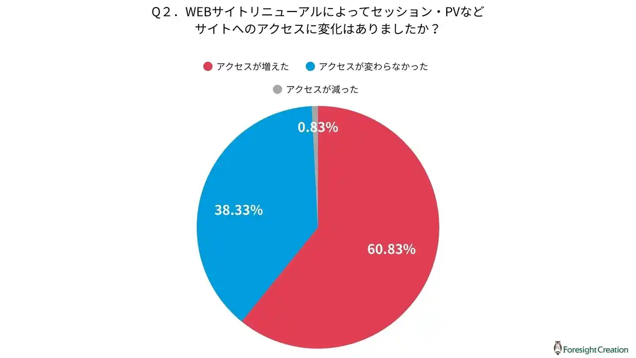 一方で、「アクセスが変わらなかった」と回答した方も38.33%存在し、リニューアルが必ずしもアクセス増加に直結するわけではないことも示されています。 |
