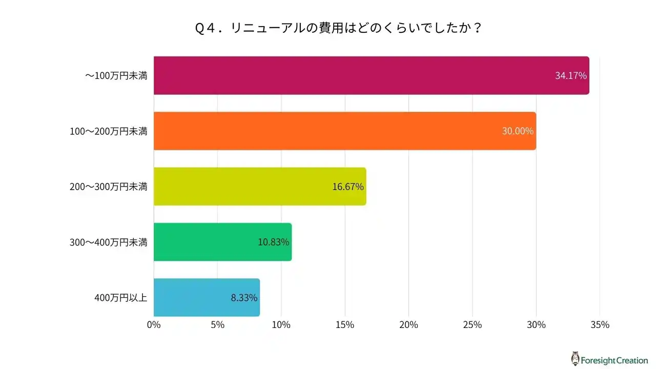 同じ質問に対して「変わらなかった」と回答した方では、リニューアル費用は、「~100万円未満」が最も多く42.1%を占めました。 |