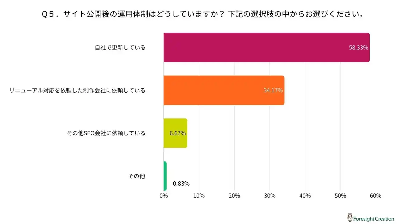 サイト公開後の運用体制について、「自社で更新している」と回答した方が最も多く、全体の58.33%を占めており、半数以上の企業が自社内で運用を完結させていることが分かります。 |