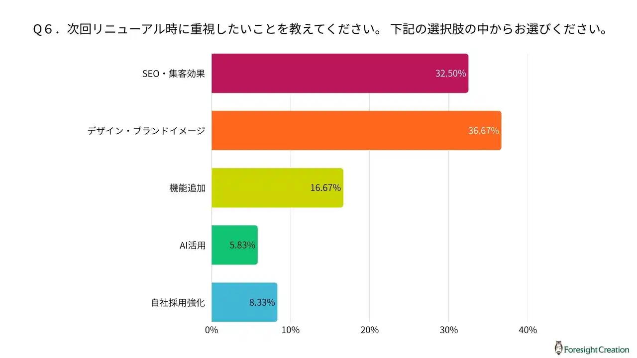 次いで「SEO・集客効果」が32.5%、「機能追加」が16.67%と続いています。 |