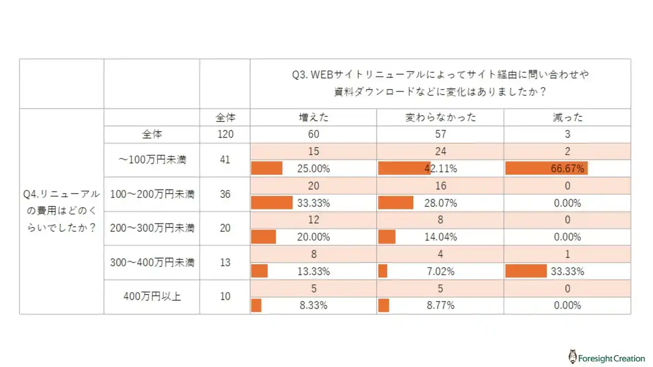 この結果から、成果が見られなかった企業は、比較的低予算でリニューアルを行っているケースが多いことが分かります。 |