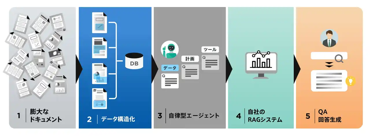 この度発表した「AgenticRAG」は、製造/化学/電機/建設など専門知識前提の業務を抱える業界での活用を想定しており、複雑なデータに対する高精度なデータ構造化と、専門的なユースケースにも対応したRAGシステムの構築が可能です。 |