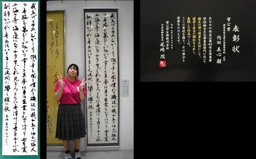 今回、全国総合文化祭において菅公賞を受賞させていただき心からうれしく思っています。集大成となる作品でしたので、海に囲まれた屋久島の環境で育った私が共感したこの詩を選びました。顧問の先生による丁寧なご指導と部員のサポートがあってここまでこれたと感謝しています。全国大会で作品の見方や書道の奥深さを知りました。このような貴重な経験での学びを後輩に伝え、これからも書を楽しむ気持ちを忘れずに努力を続けていきたいです。 |