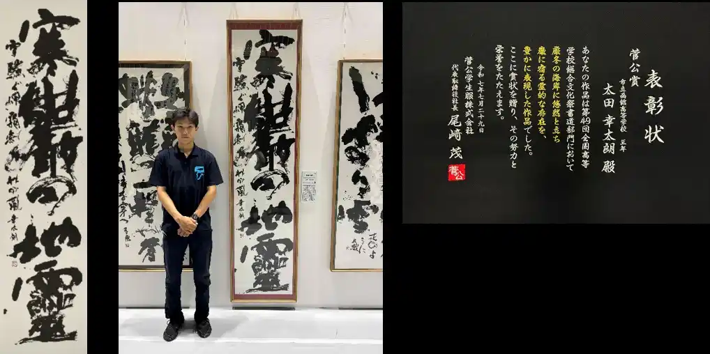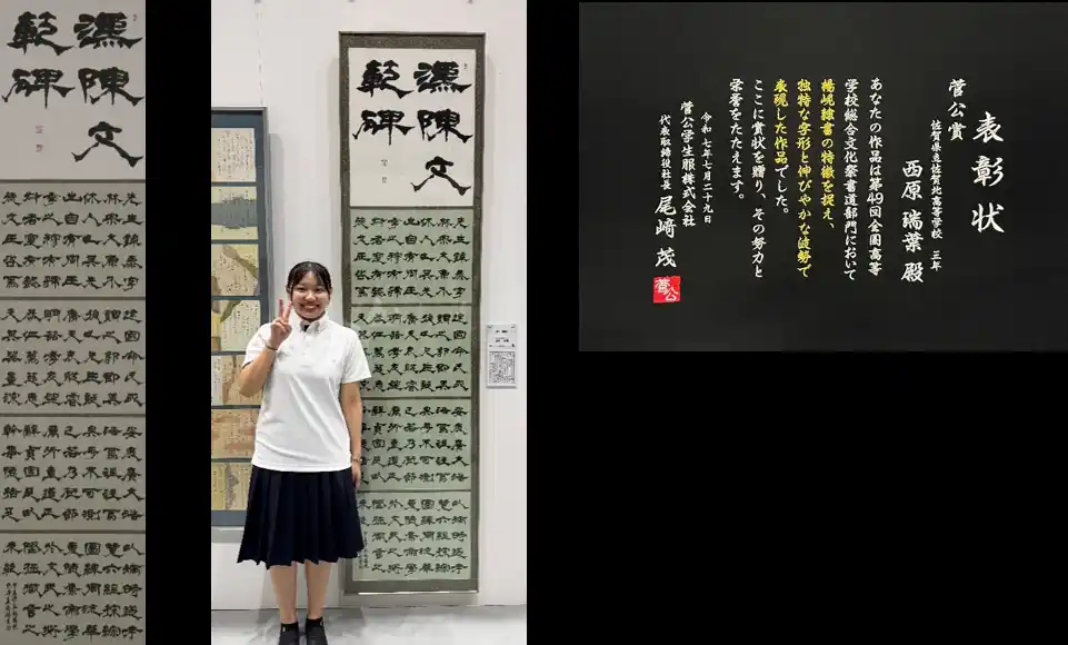 菅公学生服株式会社 (本社:岡山市北区駅元町、代表取締役社長:尾崎 茂 以下:カンコー学生服)は、 第49回全国高等学校総合文化祭(かがわ総文祭2025)(以下、総文祭)書道部門において菅公賞に選ばれた5名に制服生地に文字を刺繍で表現した賞状を10月より順次贈呈し、受賞者からの喜びのコメントが届きましたのでお知らせいたします。 |