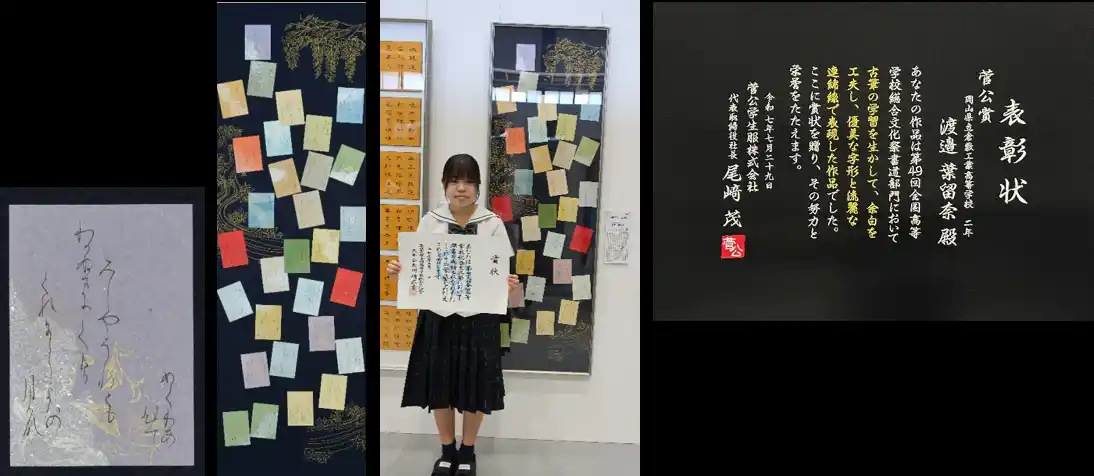 この度は菅公賞をいただきありがとうございます。工業高校でテキスタイルを学んでいる私が、地元岡山の企業から素晴らしい賞をいただき大変光栄に思っています。百人一首から好きな歌を選び、美しい料紙に仮名の持つ雅な世界を表現しました。専門科での学びを書に生かした今回の作品が評価いただけたことはこれからの高校生活の糧になると確信しています。今後も流麗な仮名の美を追求していきたいと思います。 |