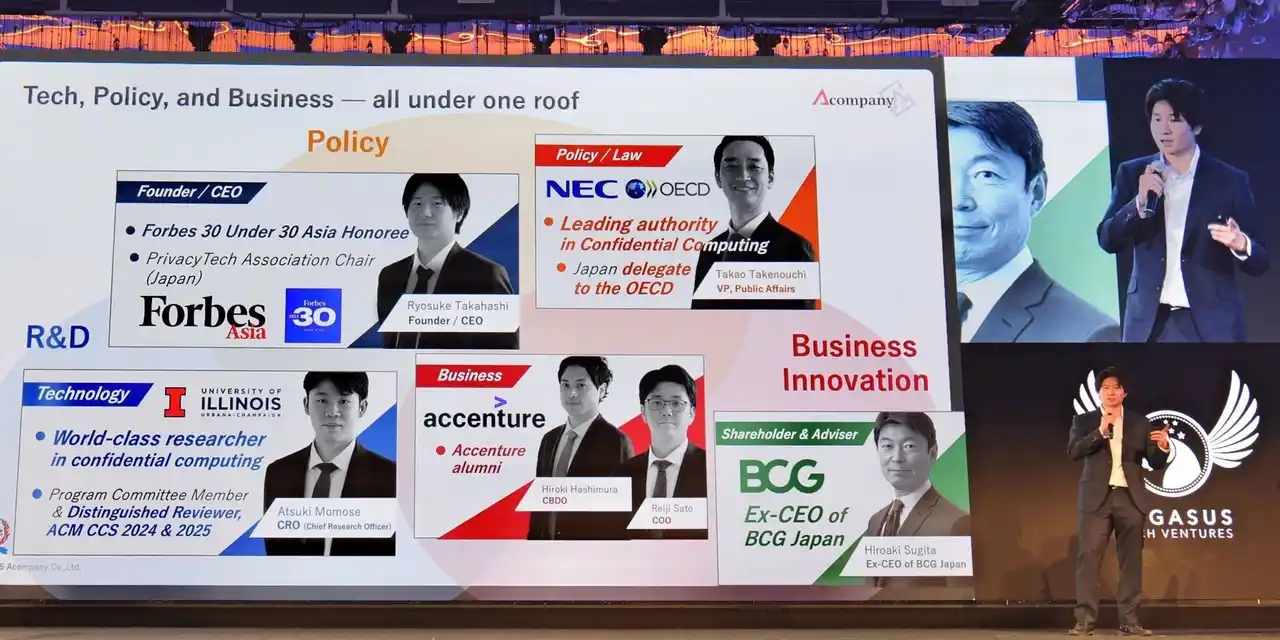 10月15日(水)に開催された準決勝戦には、世界各国から予選を勝ち抜いた強豪スタートアップが集結し、自社の優れた技術やプロダクトのピッチを行いました。日本からは、九州予選代表のトイメディカル株式会社、東京予選代表の株式会社Acompany、東北予選代表のAZUL Energy株式会社の計3社が決勝戦への出場をかけて、ステージに挑みました。その中でも、東京予選代表の株式会社Acompanyは、見事並み居る強豪を抑え、最終ファイナリスト10社に選出され、ファイナルステージでピッチを披露しました。同社は、暗号化されたままの企業の機密情報データを安全に保護しながら生成AI等で利用できる技術を提供しており、世界中の企業が生成AIの利用において抱えるデータ保護とAIセキュリティの課題を解決する効果的のソリューションとして、世界の舞台で高く評価されました。 |