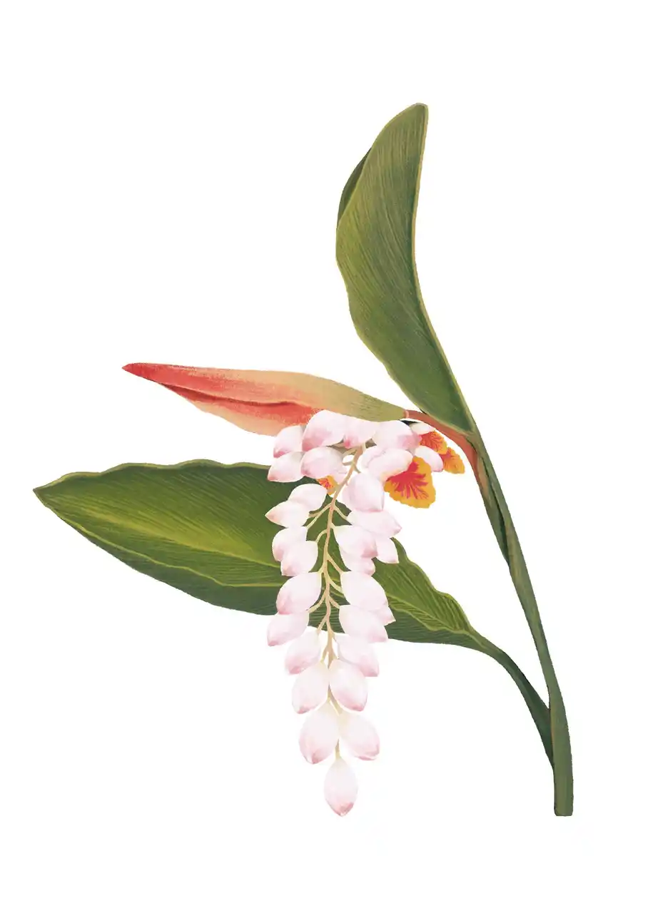 月桃は、沖縄をはじめとする亜熱帯地域に自生する、ショウガ科のハーブです。強い日差しを浴びながらも高さ2~3mまで育ち、50cmほどの光沢のある濃い緑の葉を茂らせます。夏には長さ4cmくらいの垂れ下がった可愛らしい花をつけます。沖縄では健康祈願や厄除けとして月桃の葉で餅を包んだ「鬼餅(ムーチー)」を食べたり、月桃の葉や種子をお茶にして飲むなど親しまれています。月桃にはポリフェノールやカルダモニンをはじめとする、美容と健康に嬉しい成分が豊富に含まれ、日本のみならず海外からも注目されています。 |