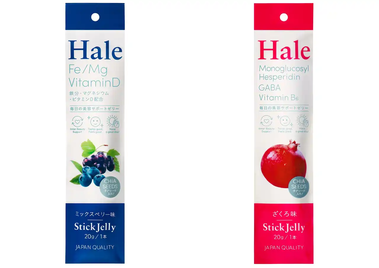 「Hale ざくろ味」には、今注目のモノグルコシルヘスぺリジン、GABA、ビタミンB6と美容をサポートする成分を配合し、「Hale ミックスベリー味」には、女性に不足しがちな鉄分、マグネシウム、ビタミンDを配合しています。2品ともに新開発の食べ応えのあるゼリー食感とチアシードのつぶつぶ感を楽しめる美容サポートゼリーです。5本タイプと手軽な1本タイプがあり、外で小腹が空いた時など、カバンに持ち運べるサイズでいつでも楽しむことができます。 |