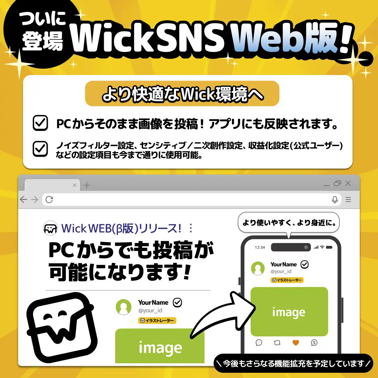 | 株式会社Wickは、クリエイターが安心して創作し、自由に発信できる環境を目指す、SNS統合型プラットフォーム「Wick」について、10月23日(木)よりSNS機能をWEBからでもご利用いただけるWick WEB(β版)をリリースすることをお知らせします。 | |||