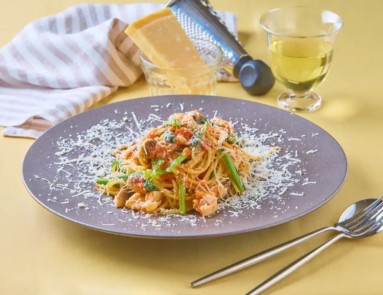 スパゲッティ 鶏肉、マッシュルーム、ほうれん草パルミジャーノトマトソース |