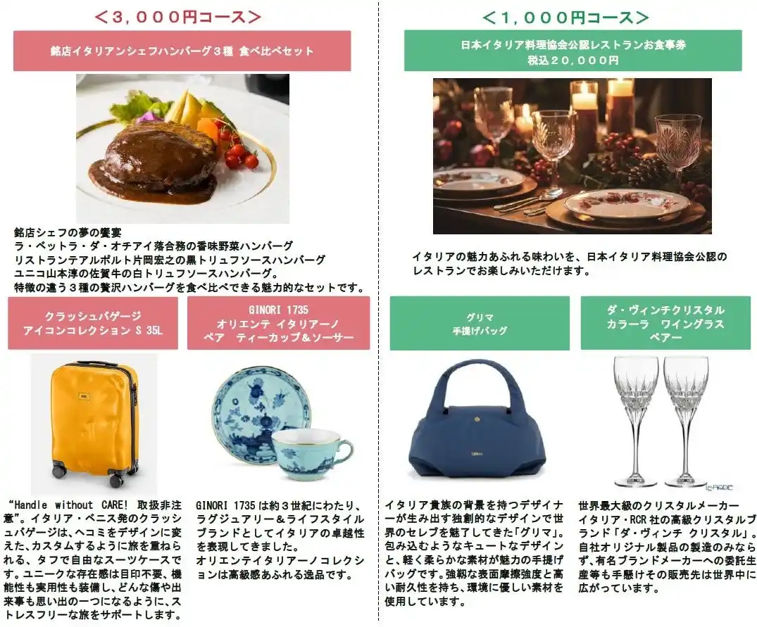 対象期間中イオングループ各店舗にて、税込1,000円または税込3,000円のお買上げレシートを1口として、全10種類から1つ選択して専用サイトからキャンペーンに応募(スマホ限定)できます。当選者には、日本イタリア料理協会の名店へのご招待や、イタリア発ブランドの服飾品・食器など、“まるでイタリア”と感じられる、イタリアにまつわるアイテムを景品として進呈します。(景品数 合計250名さま) |