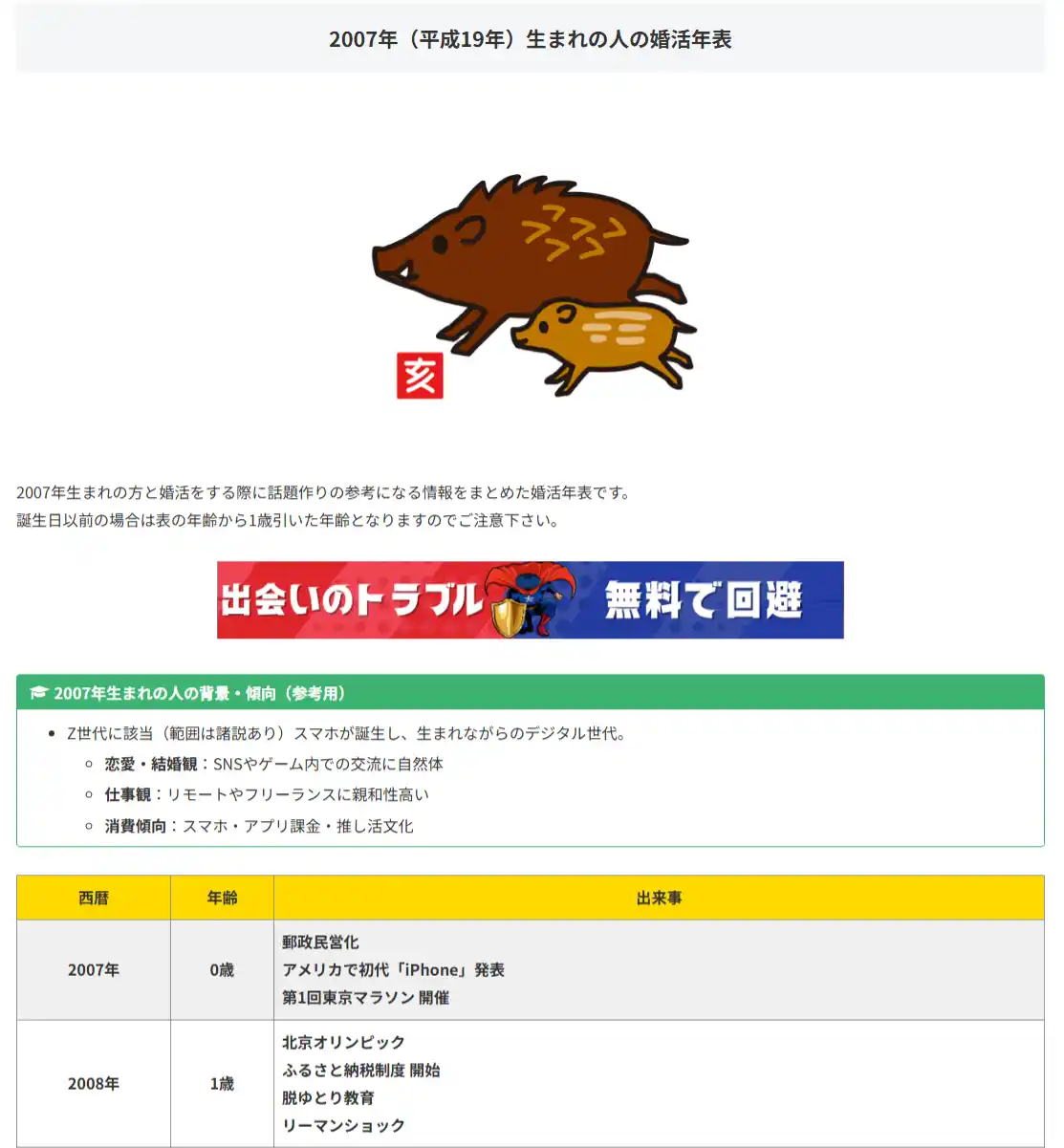 | 婚活年表の仕組みはシンプル。ユーザー登録等は不要で、お相手の「年齢」や「生まれた年」から世代の背景や傾向、出来事などをチェックする事が可能です。 | |||