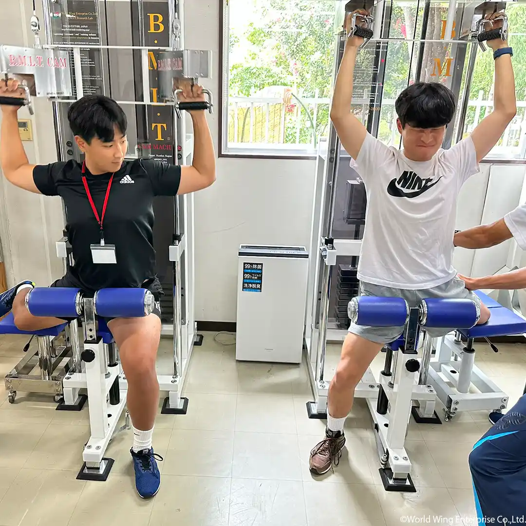 同大学体育学科の教授陣6名のご専攻は、「スポーツ医学」「スポーツ産業」「スポーツ社会学」「体育哲学」「体育教育」「体育学」です。国立木浦大学RISE事業団の学生をはじめ、総勢26名の皆様が、8月23日(土)から28日(木)まで、初動負荷理論(R)および初動負荷/B.M.L.T.CAM(R)マシントレーニングの研修に没頭されました。 |
