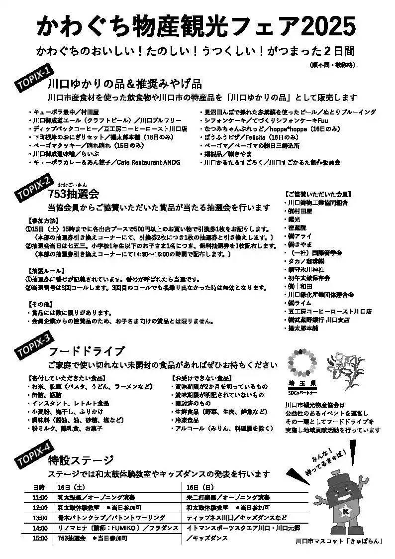 埼玉県民の食のセーフティネットをサポートするために、地域でのフードバンク活動を推進している特定非営利活動法人フードバンク埼玉(本社:埼玉県さいたま市浦和区、代表理事:とよしま亮介)は、令和7年11月15日(土)・16日(日)に開催される「かわぐち物産観光フェア