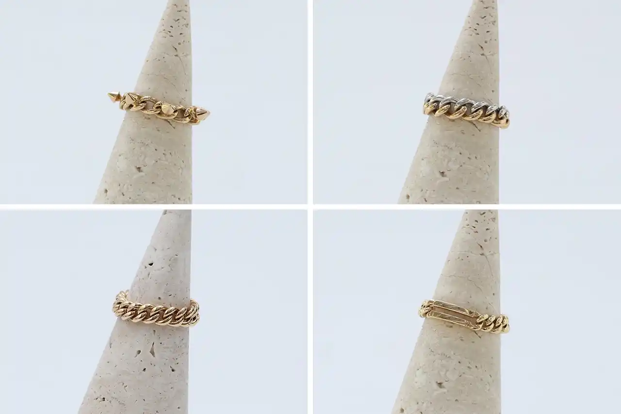 | 手元に統一感のある輝きをもたらし、チェーンリング同士の重ねづけはもちろん、他ブランドのジュエリーとも自然に調和します。ミニマルな構築の中に個性を宿し、コーディネートに奥行きと静かな強さを添える存在。 | |||