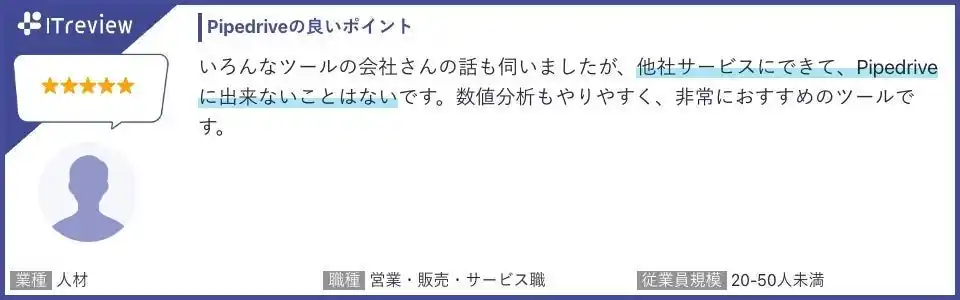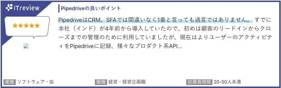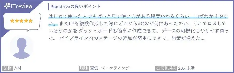 | 「Pipedrive」は、ITreviewで平均★4.6(2025年6月30日時点)という高評価を獲得し、実際のユーザーからも「営業プロセスの効率化が劇的に進んだ」「使いやすいUIで、誰でも簡単に操作できる」などの声をいただいています。当製品のご利用者様から実際に寄せられたレビューを一部ご紹介します。 | |||