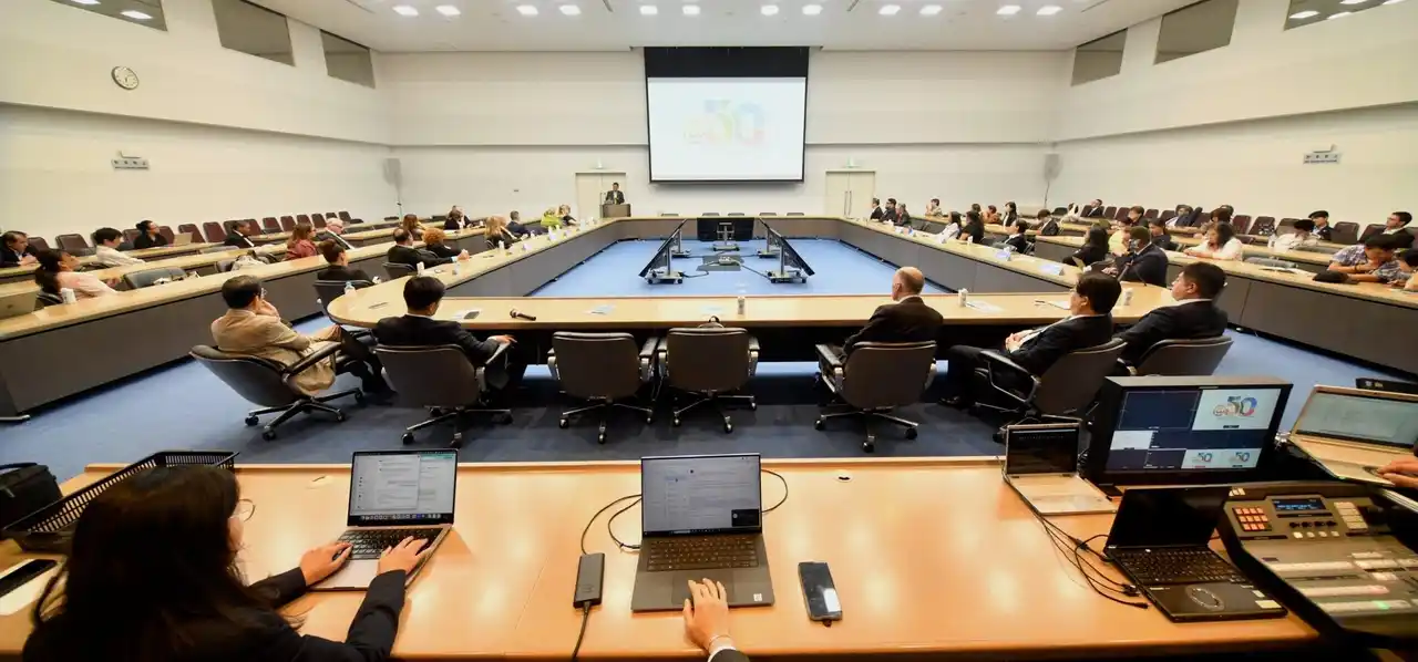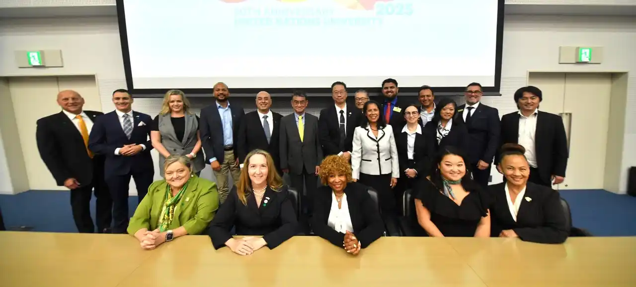 9日と10日、舞台は東京・国連大学(UNU)へ。9日の前夜祭レセプションは、国連大学のホール内で華やかに開催された。会場には日米の自治体関係者や国際機関の代表者らが集い、温かな雰囲気の中で開幕を迎えた。冒頭では、主催者を代表して日米姉妹都市協会(JUSSCA)の小山田真会長が挨拶に立ち、サミットの意義と、日米の地方が担う新たな外交の形について力強く語った。続いて、元駐米日本大使でありカルコン日本側委員長を務める佐々江賢一郎氏がスピーチを行い、日米間の地域連携の歴史的意義と今後の展望について述べた。会場の期待が高まる中、JUSSCA理事長のアントニー・アルジェイミー博士が乾杯の音頭を取り、出席者たちはグラスを掲げてサミットの成功と友情の深化を祝した。 |