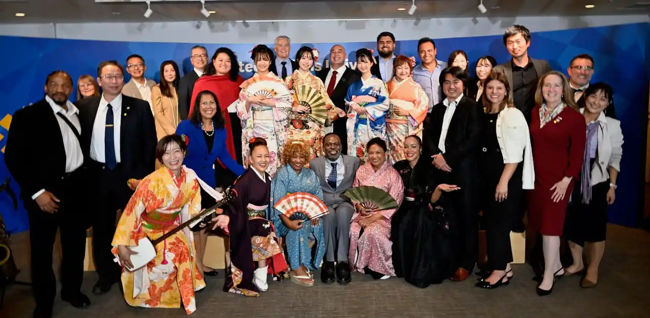 10日のクロージング・レセプションは、国連大学内で行われた。着物ショー、ジャズの生演奏、三味線の響き。文化が交差する空間で、参加者は姉妹都市間の関係強化を祝し、気候変動対策、デジタルインクルージョン、異文化理解の促進を改めて誓い合う。「このレセプションは米日財団、国際交流基金日米文化教育交流会議(カルコン)のご協力なしには実現しませんでした」とアルジェイミー理事長は結んだ。 |