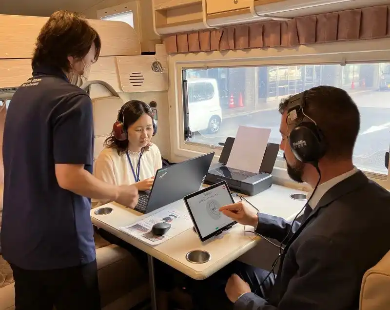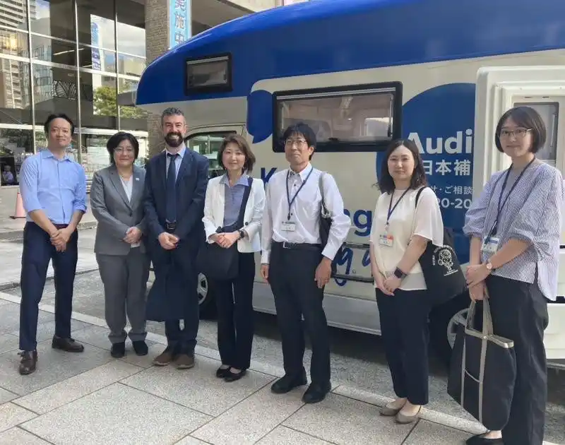 続いて岡山市役所を訪れ、同市が取り組む加齢性難聴対策について意見交換しました。世界アルツハイマーデーに合わせて同日に開催された講演会やパネル展示、加齢性難聴の早期発見・早期ケアの重要性を紹介する動画のほか、聴覚検診車「Audika Go」による検診の様子も見学し、行政の役割、企業の社会的責任、補聴器技術の将来などをテーマに岡山市、本学、企業の担当者と意見を交換しました。博士は、聴覚検診車を活用して、行政・大学・企業が連携し加齢性難聴対策に取り組む国際的にも珍しい仕組みについて、「行政・企業・大学などの公民連携(Public Private Partnership:PPP)の好事例」として高く評価し、その効果検証と今後の展開に期待を寄せました。 |