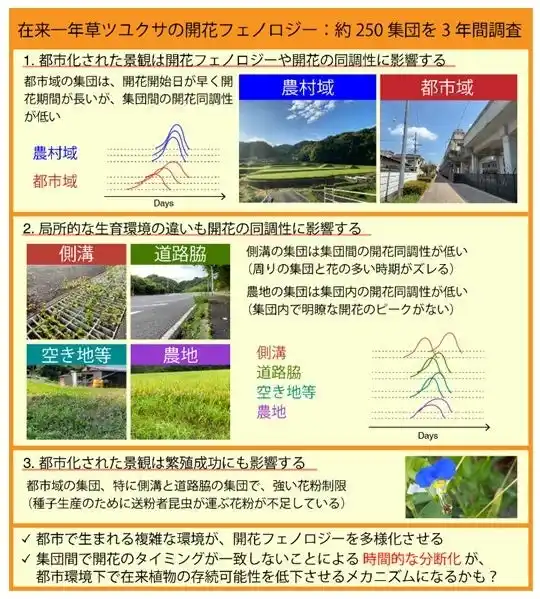 | 本研究の結果は、都市環境下で生まれる多様な局所的環境(側溝の中や公園、残存する農地等)に応じた開花タイミングの多様化を通して集団間の開花タイミングにズレが生じる“時間的な分断化”が、植物の繁殖成功や存続可能性に影響しうることを示唆する初めての報告です。本研究成果は、自然と調和した持続可能な都市生態系の構築のための重要な知見となることが期待されます。 | ||||||||||