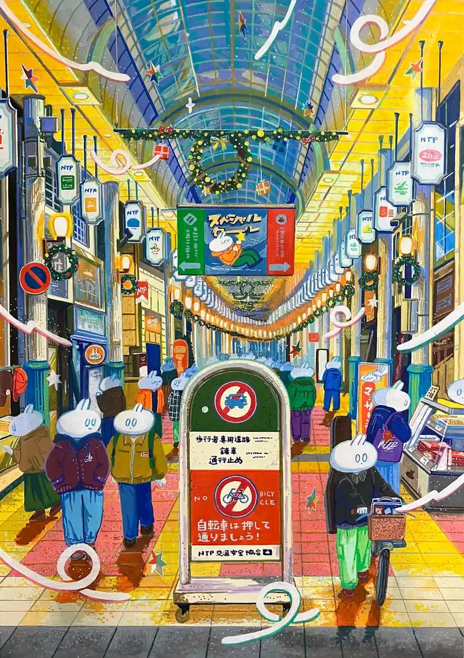 弓指貴弘は鬼をポップに再構築し、日本的な畏れの美意識を表現。ヨシサコツバサは、絵画技法を活かし、風景に紛れるうさぎを描いて日常に潜む寓話の世界を展開しています。 |