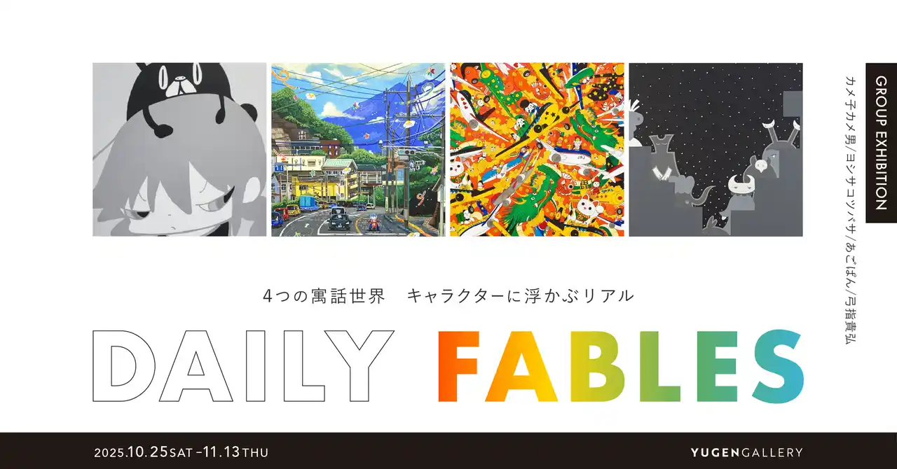 YUGEN Gallery FUKUOKA(福岡県福岡市中央区大名2-1-4 ステージ1西通り4F)では2025年10月25日(土)よりグループ展「Daily Fables」を開催しております。参加するのは、あごぱん、カメ子カメ男、弓指貴弘、ヨシサコツバサの4名。キュレーションは野間博尊が担当します。 |