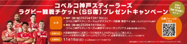 大感謝祭期間中に、北野エースの商品を3,240円(税込)以上ご購入の上、レシートを専用の応募フォームからアップロード、必要事項を記入してご応募ください。抽選で神戸・東京の各会場5組・10名様にコベルコ神戸スティーラーズラグビー観戦チケット(SS席)をプレゼントいたします。応募締切:11月16日(日)
