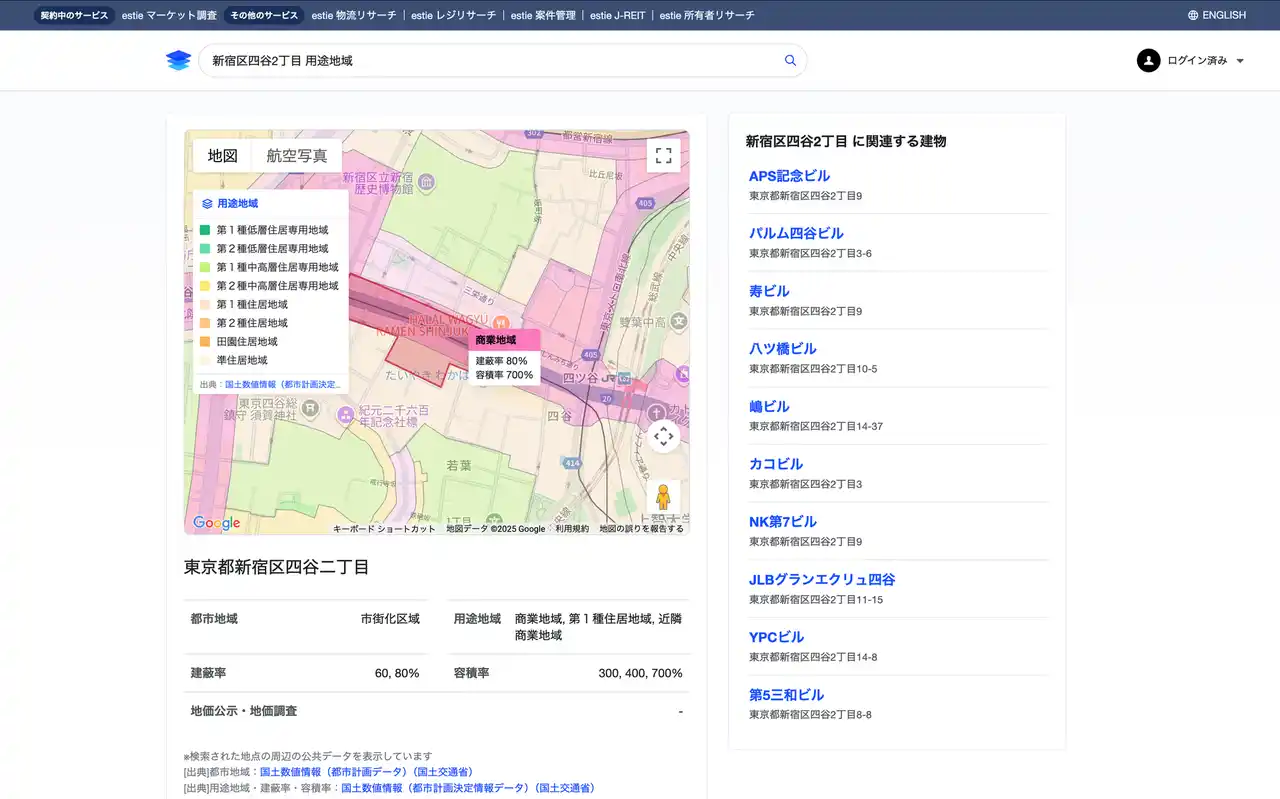 記事や建物情報とあわせて、都市計画や地価に関する公共データを同時に参照できることで、調査工数を削減しつつ、より多角的な情報収集が可能になります。 |