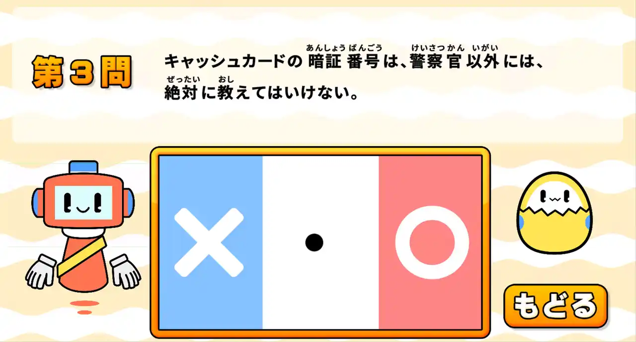 本ゲームはプレイヤーが専用シートに座った状態でクイズに挑戦します。重心を左右に傾けることで(難易度調整も可能)、○×を選択して回答、素早く回答することで多くの得点を獲得することができます!今回は愛知県警察による、特殊詐欺クイズを実装し、防犯ボランティア団体「アイチレディース4豊明支部」と、大学生防犯ボランティア「APP(あいちパトロールピーポー)」が、5対5のチーム対抗戦を行い、合計得点で競い、特殊詐欺に関する知識を得ました。「よっこいチョイス」は、クイズに集中する中で、自然に、座った姿勢で左右に身体を傾けて姿勢を保つ、いわゆるバランス運動となり、リハビリテーションにも活かせるコンテンツです。 |