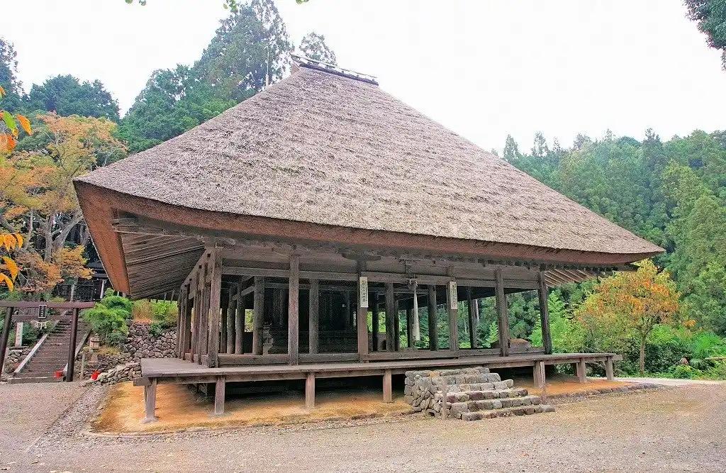 高野山の麓、“歴史の隠れ里”とも言われる有田川町杉野原地区で、古来よりこの地に暮らす先人たちが守ってきた「雨錫寺阿弥陀堂」。現在の阿弥陀堂は永正11年(1514年)に建立されたもので、国の重要文化財に指定されています。重厚な茅葺き屋根で、桁行・梁間5間(11.67m)の一重寄棟造、須弥壇と厨子を置く他は間仕切りがない開放的な建築が特徴です。 |