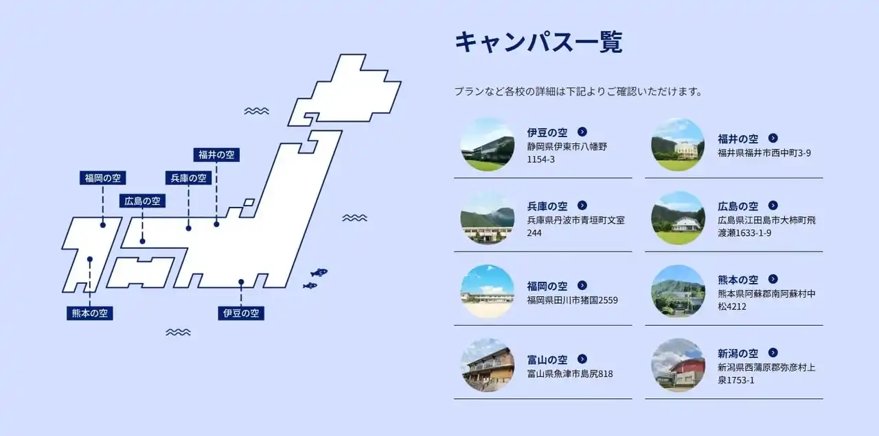 「ドローンキャンパス【熊本の空】」を熊本県南阿蘇村に開校。 2024年9月 「ドローンキャンパス【広島の空】」を広島県江田島市に開校。 |