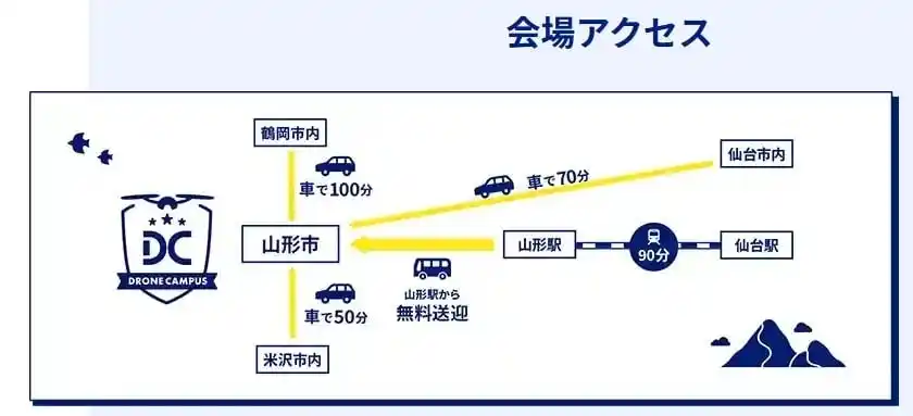 | この度、山形市で開校する「ドローンキャンパス【山形の空】」は全国9スクール目となり、提携する「旧双葉小学校」の利用者が少ない平日の昼間などを活用し、地元の食堂や飲食店とも連携するなど地域資源の活用を重視した特色ある合宿免許型ドローンスクール運営を展開していきます。今後は山形に拠点を置くことで、東北圏からのアクセス向上と地元企業・自治体との共創をさらに推進します。 | |||||||||||||||||