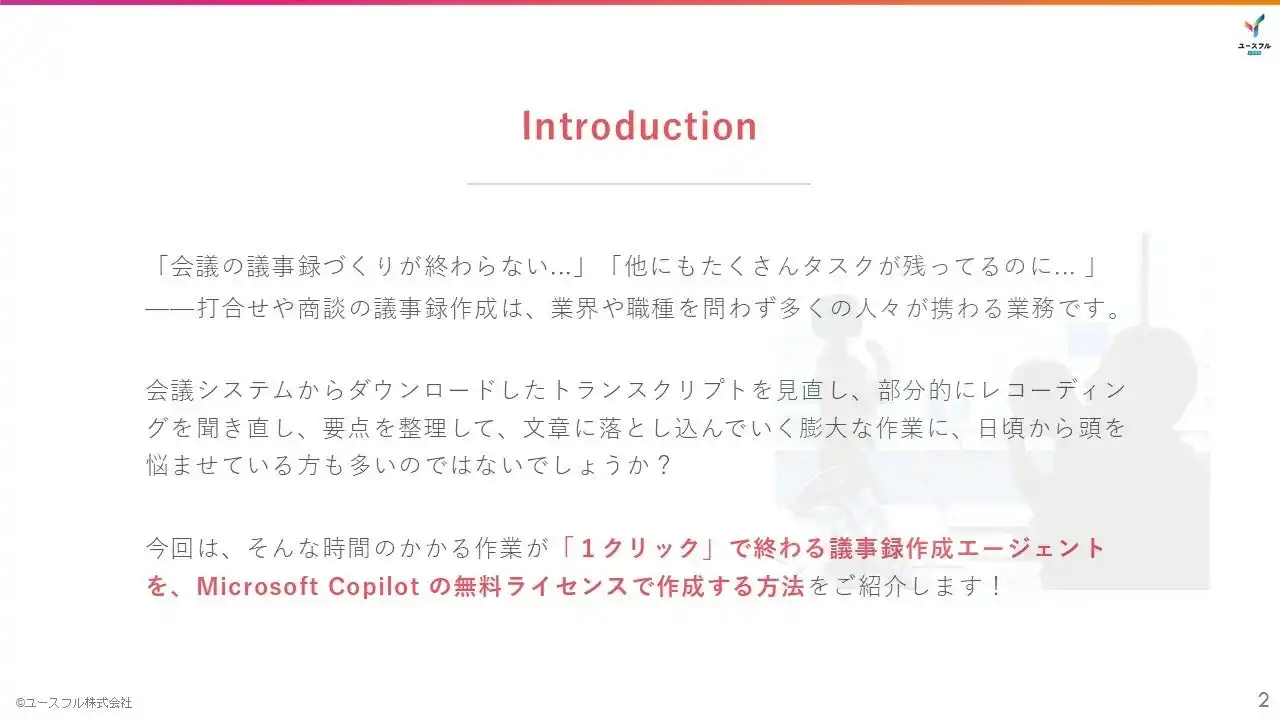 ■内容:Copilot エージェントを活用した議事録作成の自動化支援 |