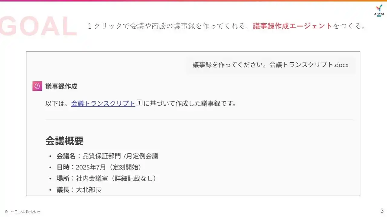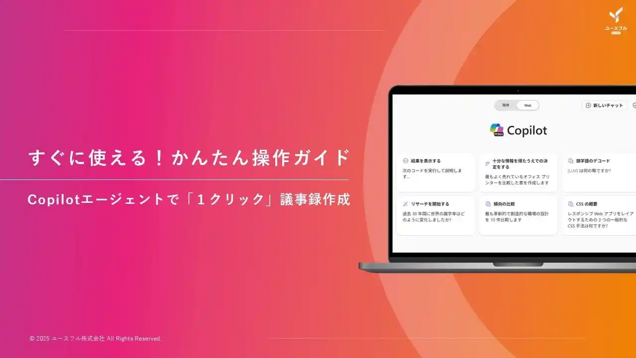 ユースフル株式会社(本社:東京都千代田区、代表取締役:大垣 凛太郎)は、2025年10月15日、Copilot Studio Liteを用いた「議事録作成エージェント」の具体的な構築手順を紹介するYouTube動画と、詳細な「構築ガイド」を無料公開しました。これは、生成AIの活用に関心を持つものの、技術的なハードルを感じていた市民開発者(非エンジニア)を主な対象とした教育リソースです。本ソリューションは、会議や商談の文字起こし情報から自動で議事録を生成することを可能にし、企業におけるDX推進と本質的な業務効率化を支援します。 |