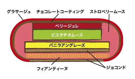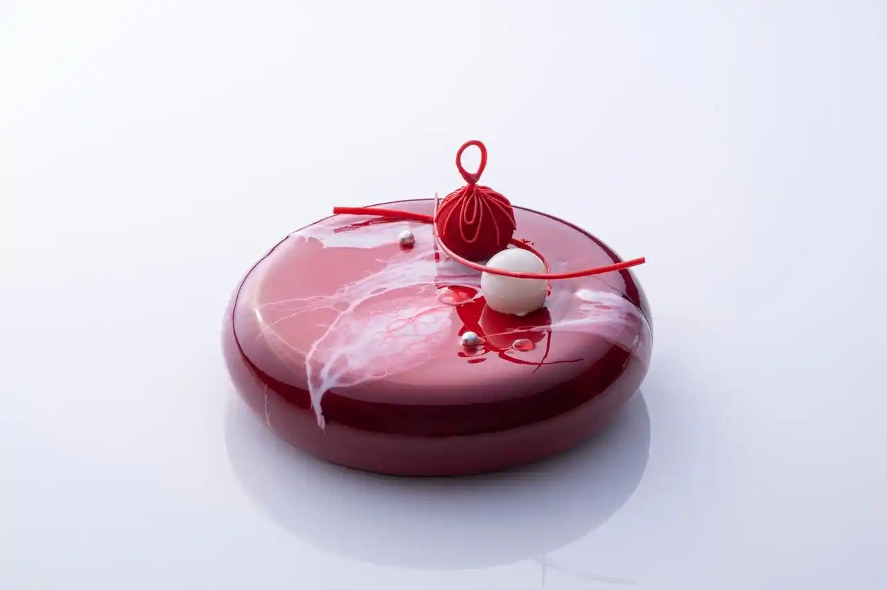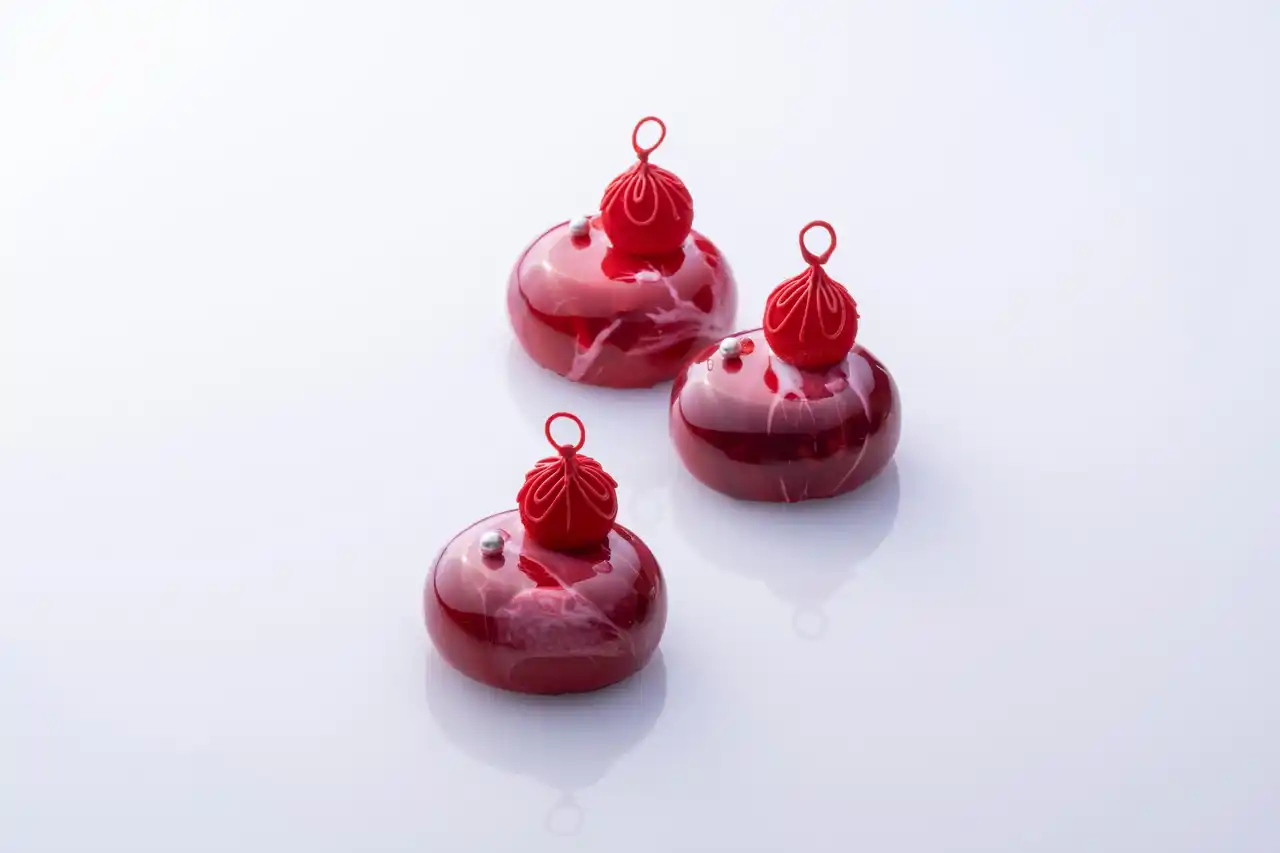 2品目の「オーナメント・フレーズ」は、艶やかで鮮やかな赤いミラーケーキです。赤は燃える炎のような情熱を、アクセントの白いラインは雪を表し、力強くエネルギッシュなデザインに仕上げました。中には、芳ばしいピスタチオの香りと優しい甘さのストロベリームース、甘酸っぱいベリージュレを加えて味にアクセントを施し、土台にはジョコンドスポンジとフィアンティーヌで異なる食感を組み合わせました。トップには祝福と絆を意味するチョコレート製の赤いオーナメントを飾った、華やかなホリデーシーズンにぴったりのケーキです。 |
