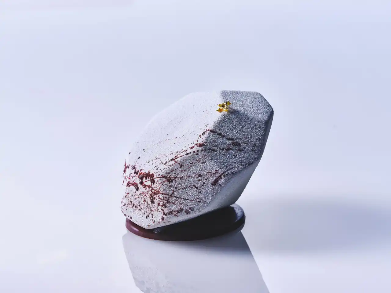 「ブリリアント・ストーン」は、なめらかなチョコレートムースに香ばしいヘーゼルナッツのプラリネ、そして甘酸っぱいリンゴのコンポートの豊かな風味が広がるムースケーキです。とろけるような口当たりのムースに、アーモンドを使ったしっとりとしたジョコンド生地、フィアンティーヌとヘーゼルナッツのクランチな食感を重ねました。チョコレート、リンゴ、ナッツが作り出す、ホリデーシーズンにふさわしい味わいをお楽しみください。ダイヤモンドカットに、雪景色のような白、金箔をアクセントに施した「ブリリアント・ストーン」は、ギフトとして、テーブルの主役としてぴったりの一品です。 |