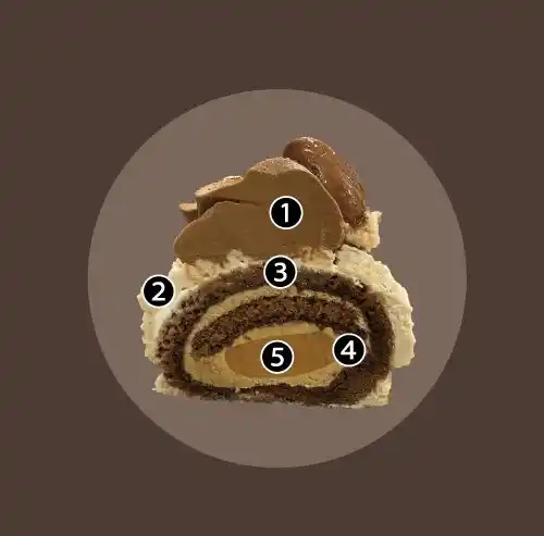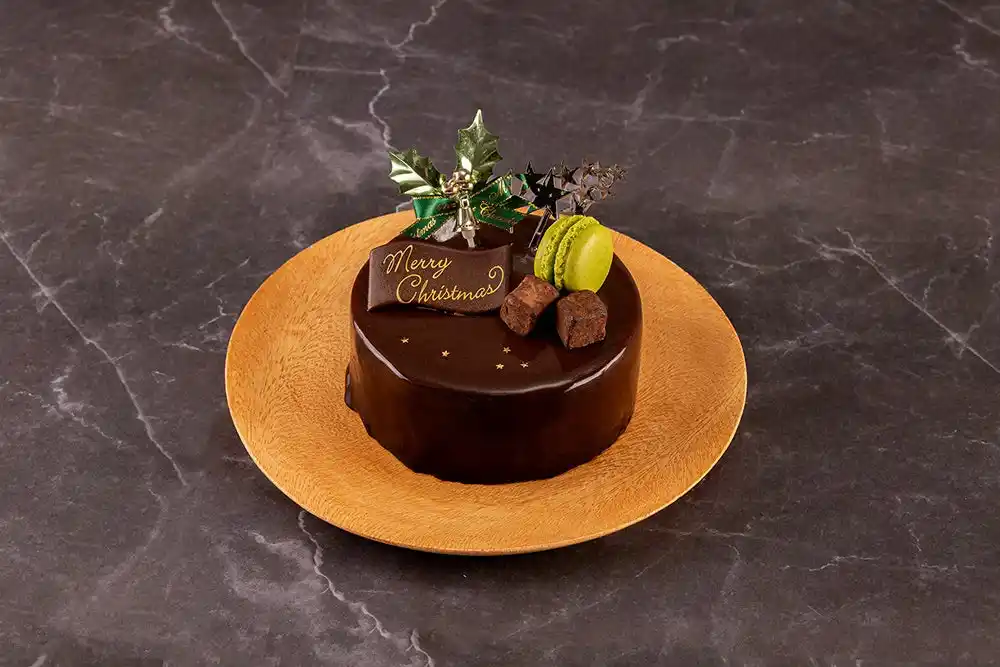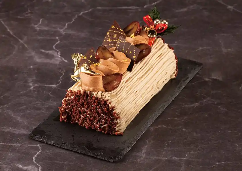 四万十栗のペーストを使った栗クリーム、ほんのりビターなチョコクリーム、香り高いコーヒークリーム、コク深いキャラメルムースをチョコスポンジで巻き上げた、贅沢な大人のブッシュドノエルです。 |