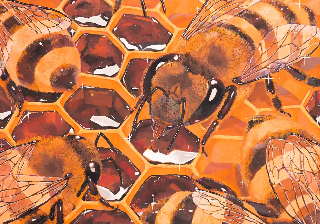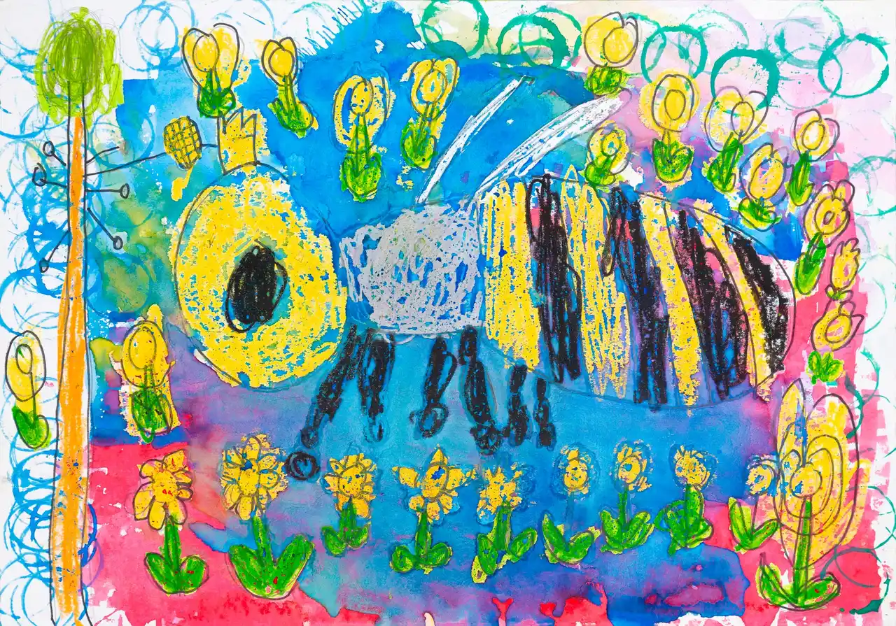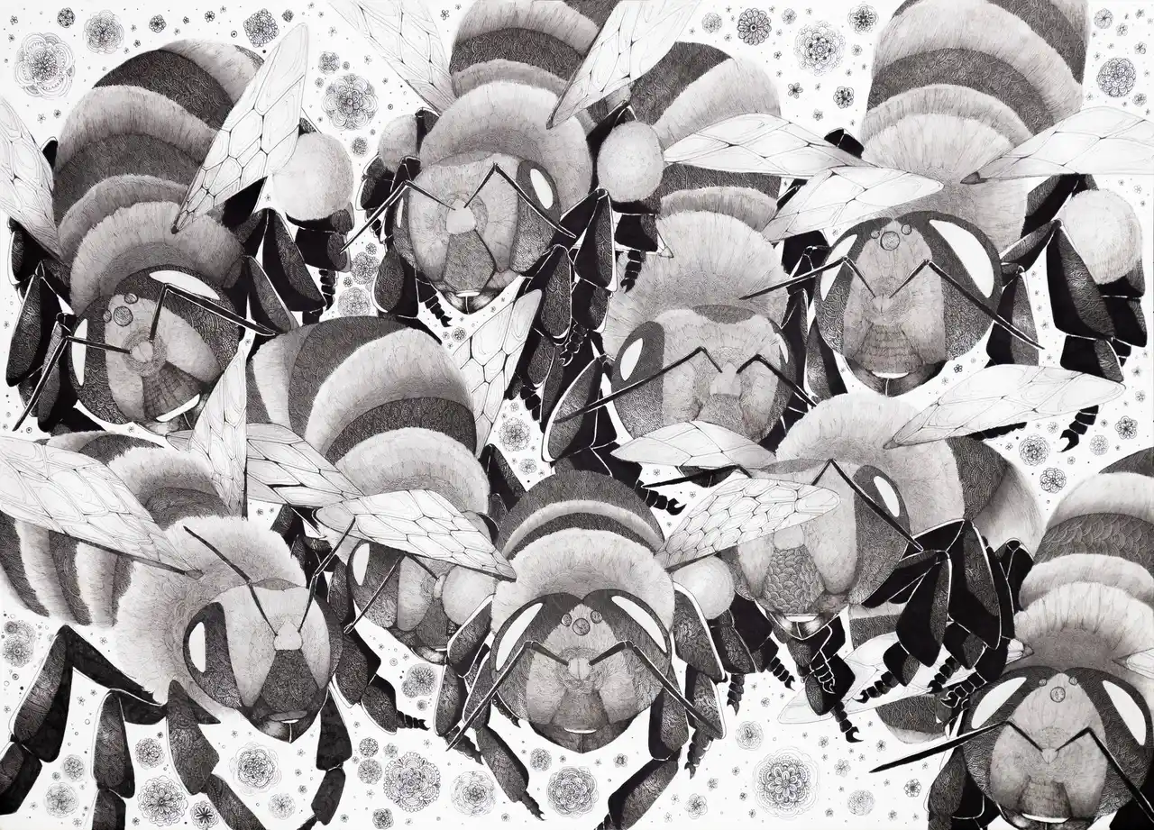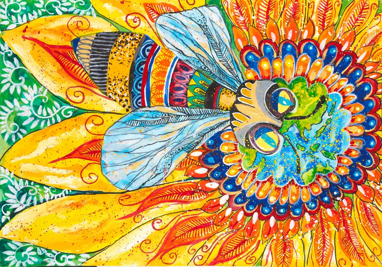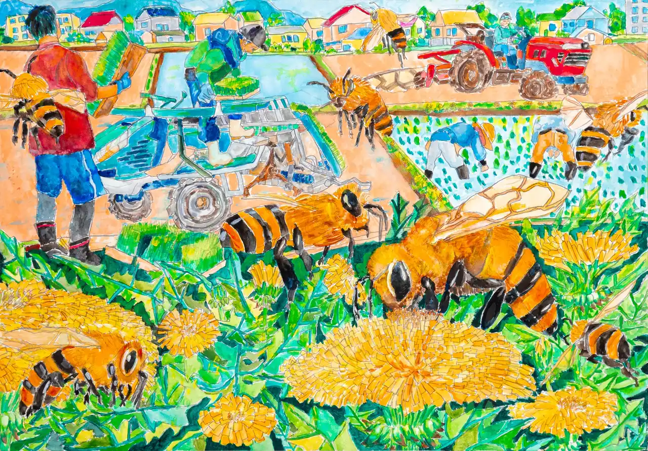 農作物や自然界の植物の多くは、ミツバチが行う花粉媒介(ポリネーション)によって果実を実らせ、次世代へと命をつないでいます。ミツバチを描くことは、ミツバチと植物との関わりを学び、自然環境の大切さを改めて考えるきっかけとなります。 |