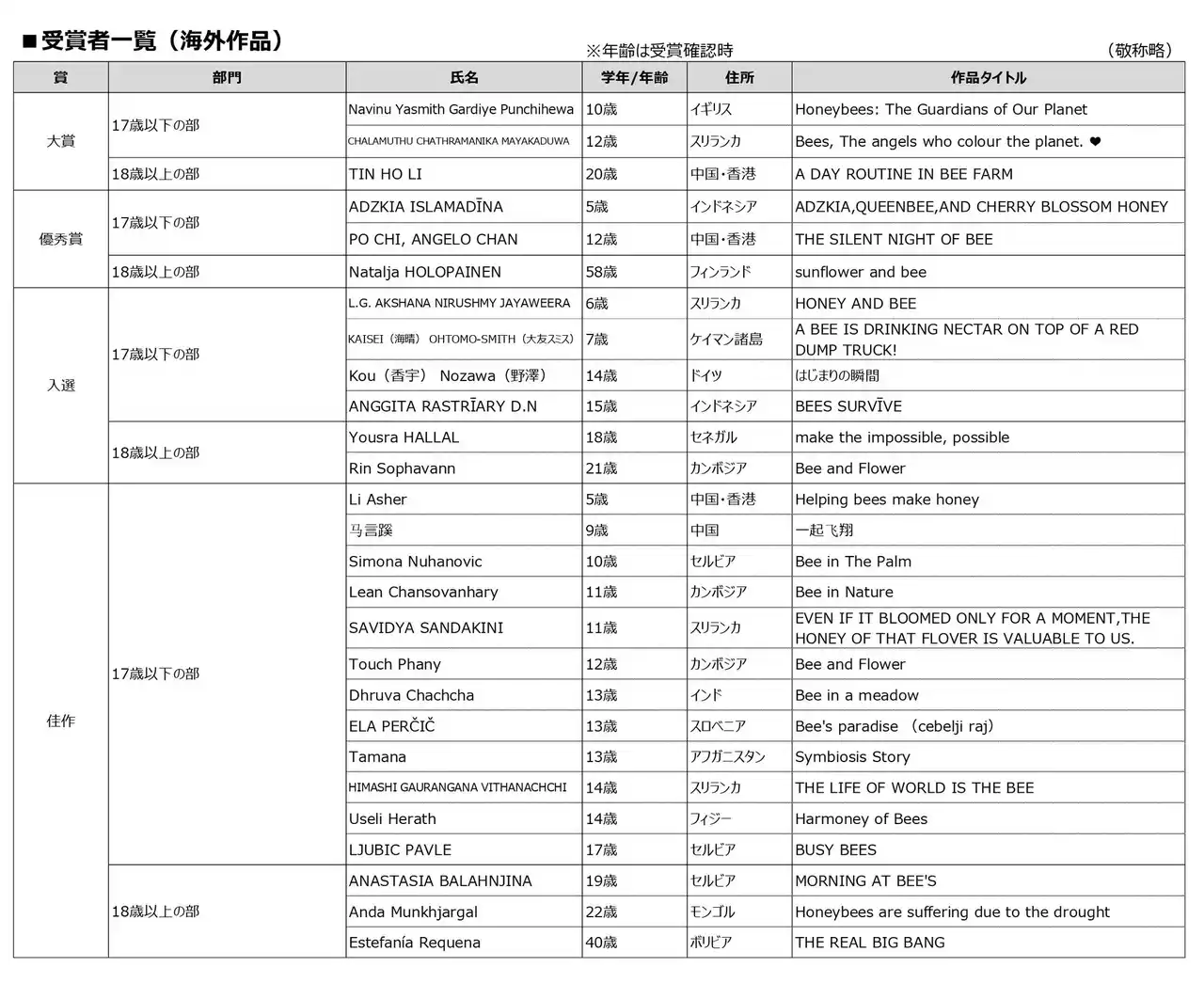 株式会社山田養蜂場(所在地:岡山県苫田郡鏡野町、代表取締役社長:山田英生)は、2025年10月25日(土)、岡山県・山田養蜂場本社にて、第13回「ミツバチの一枚画コンクール」表彰式を実施いたしました。本コンクールは、「自然環境の大切さ」「助け合うことの大切さ」「いのちの大切さ」をテーマに、自然との共生を描く一枚画を国内外から募集し、応募作品1点につき1本の植樹を行う取り組みです。今年は、日本を含む23の国と地域から総数23,697作品の応募がありました。応募いただいた国と地域の数は、過去最多となります。 |