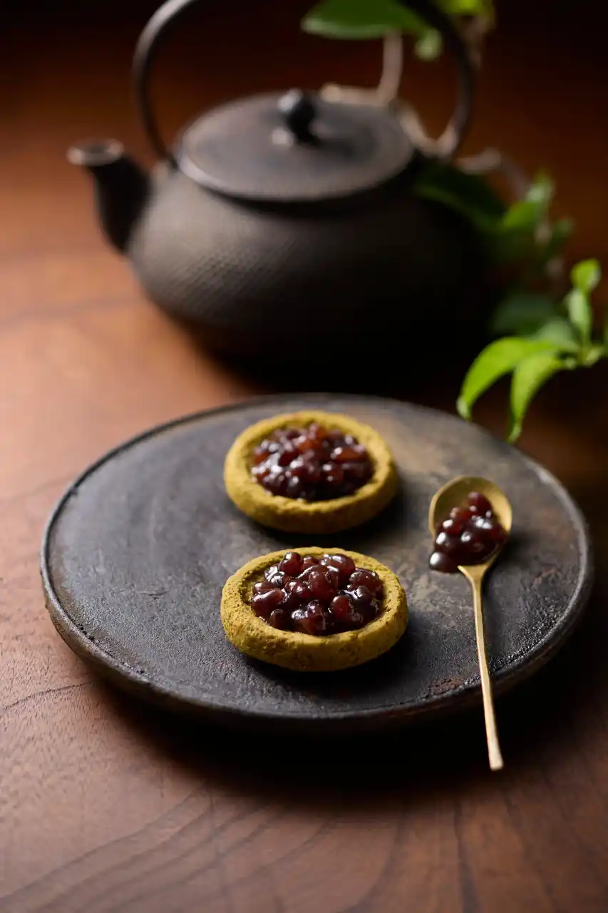 宇治抹茶「天緑」を使ったお濃茶サブレに、北海道産小豆餡を添えてお召し上がりいただく、新感覚スウィーツをご用意しました。 |
