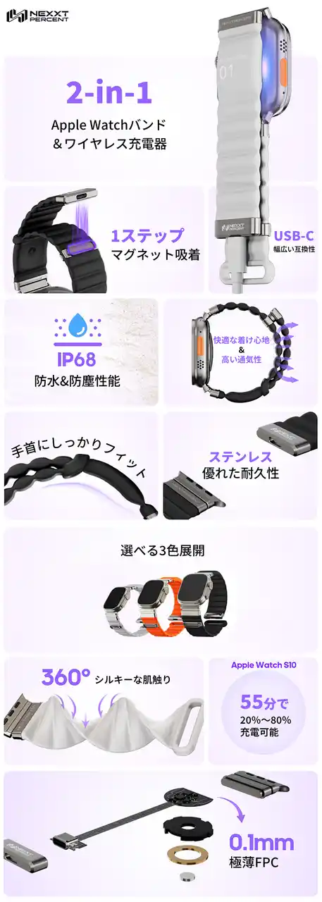 「NEXXT PERCENT Pro」(ネクストパーセントプロ)は、“Apple Watchを充電するには専用充電器が必要”という従来の常識を覆し、充電スタイルを一新してくれる次世代Apple Watch特化型充電バンド。 |