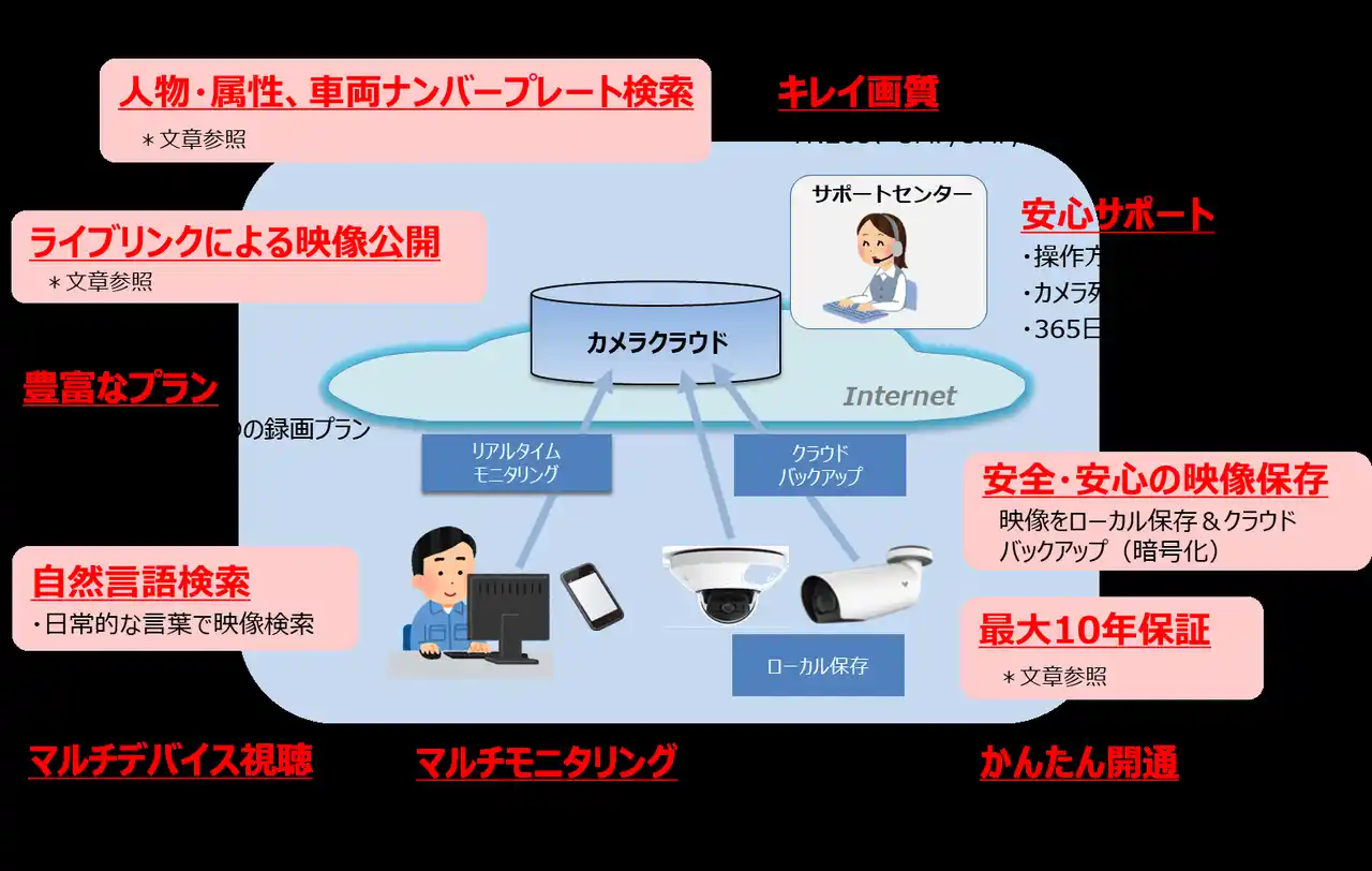 そこで今回、カメラ端末の高耐久設計により、業界最長クラス最大10年保証を実現することで、故障・経年劣化による交換頻度が減り、お客さまのリプレイスコストを大幅に削減します。 |