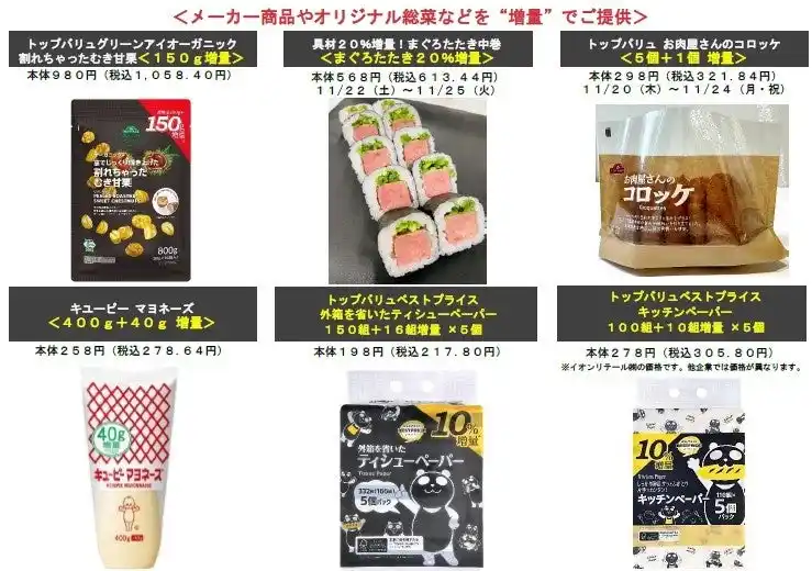 <メーカー商品やオリジナル総菜などを“増量”でご提供> |