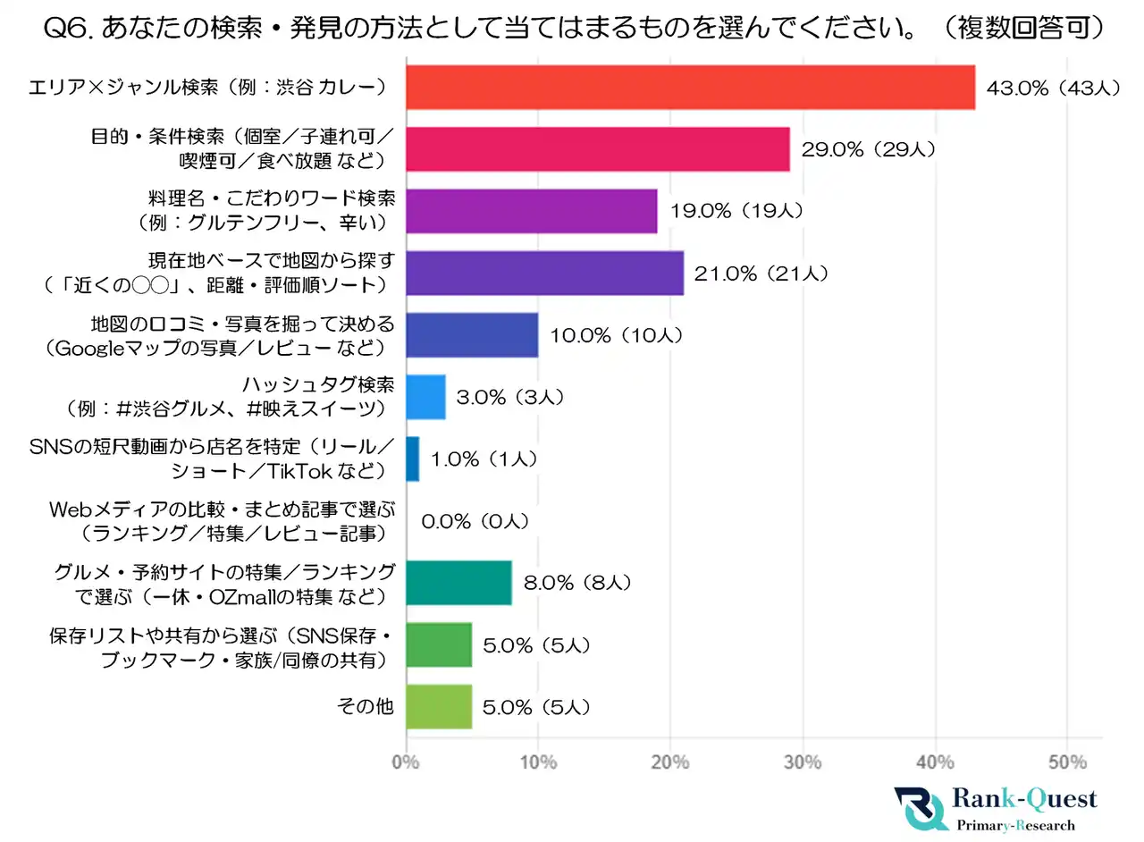 最も多かったのは「エリア×ジャンル検索(例:渋谷 カレー)」で、43.0%(43人)でした。エリアと料理ジャンルを組み合わせた具体的な検索方法が最も一般的であり、目的の場所や食べたい料理を明確にして探す実用的なスタイルが主流となっています。 |