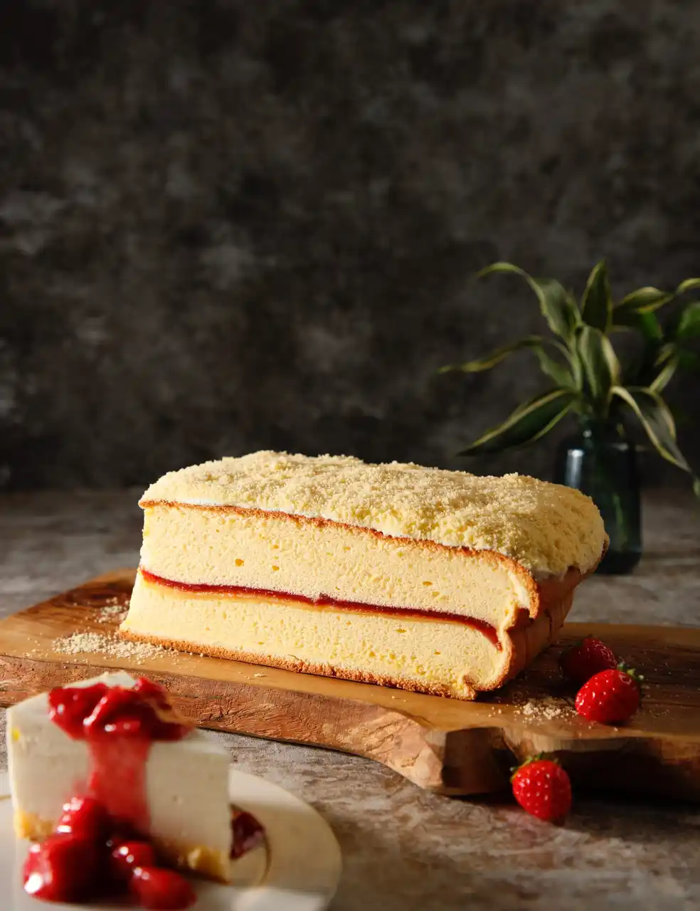 | 「ふわっ」「とろっ」「しっとり」の三重奏のような食感が魅力の人気スイーツを、台湾カステラで再現しました。特製の濃厚ベイクドチーズケーキと苺ソースをカステラの中央に閉じ込め、仕上げにはほろっと口どけの良いケーキクラムを散りばめています。プレーンカステラとチーズケーキ風味のカステラが重なり合い、口の中で広がる奥深い味わい。寒さが増すこの季節にぴったりの「苺のダブルフロマージュカステラ」を、ぜひお楽しみください。 | |||||||||