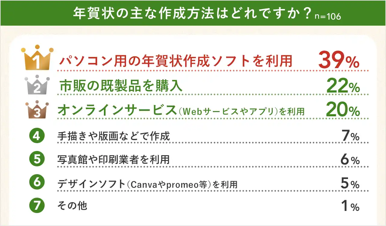 紙の年賀状を出す人に作成について聞いたところ、主な作成方法は「パソコン用の年賀状作成ソフトを利用」と回答した人が39%と最多、次いで「市販の既製品を購入」が22%、「オンラインサービス(Webサービスやアプリ)を使用」が20%と続く結果に。年賀状ソフトを使いパソコンで自作する人がまだ多いものの、手軽に作成できるオンラインサービスや既製品に頼る人も4割以上いて、準備の負担を減らしたい人も多いことがわかりました。一方で、デザインソフトやフリーソフトを活用する人や、手描きや版画で白紙から作る人も一定数いて、年に一度だからこそオリジナルにこだわりたい思いを持った人もいました。 |